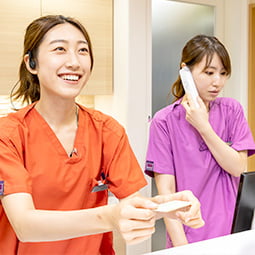 患者さんを笑顔で迎え入れたら診療がスタートします。受付業務やドクターのアシスタントをはじめ、TC(トリートメントコーディネーター)業務などさまざまな内容の仕事をこなします。